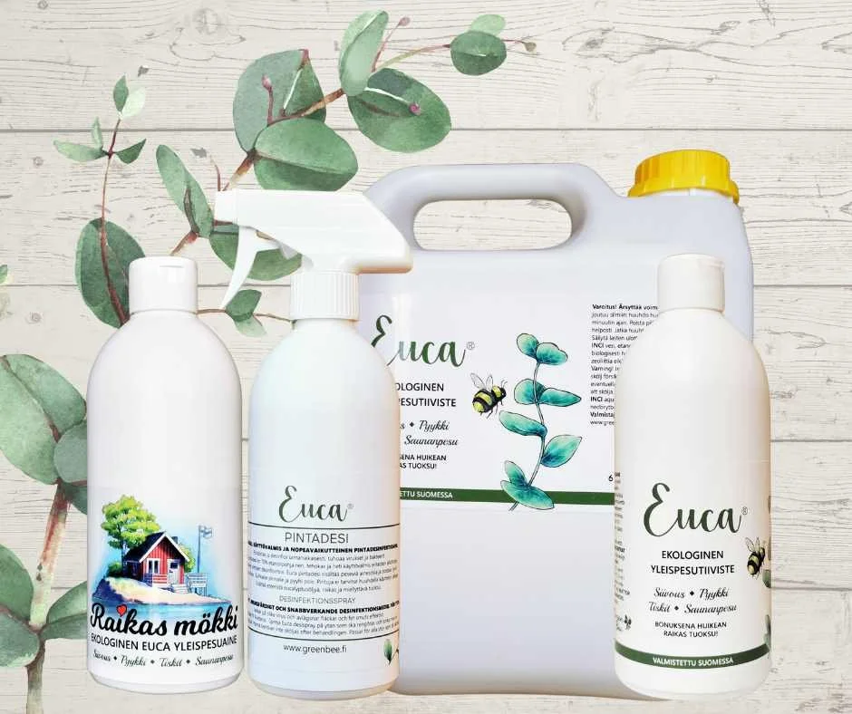 Eucan ainesosat: Aqua, Etanoli 5-15%, eteerinen eucalyptusöljy, biologisesti hajoavat tensidit.